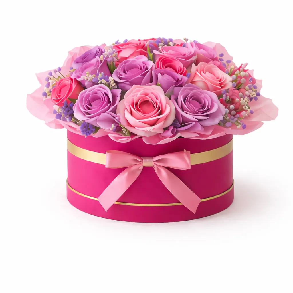 Fuchsia (pink) box with gold details, purple and pink roses with pink tissue paper detail. Smaller sizes will include filler floral mix.